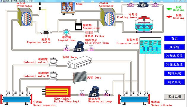 7、中央空調(diào)虛擬仿真演示系統(tǒng)"是基于動畫模式,客戶端采用計算機虛擬仿真技術(shù),以FLASH動畫的形式來仿真中央空調(diào)的工作流程(包括正常工作流程和故障工作流程)、故障產(chǎn)生過程現(xiàn)象、故障排除過程現(xiàn)象。軟件中有主要有三部分組成: