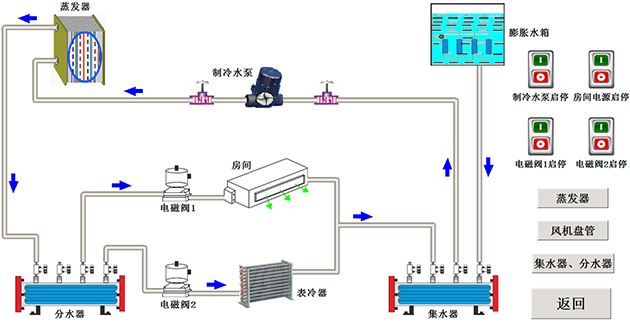 (1)、系統(tǒng)主要部件說明組成:如壓縮機、卻水泵、冷卻風(fēng)機、風(fēng)機盤管、分水器、集水器、表冷器等。