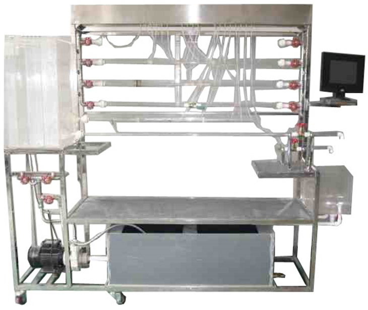 移動式不銹鋼實驗臺、儲水箱;雷諾測試管;伯努利測試管;沿程阻力系數(shù)測試管;突擴、突縮測試管;閥門局部阻力系數(shù)測試管;孔板流量計測試管;文丘里流量計測試管;和皮托管測試管;測壓板直接顯示總水頭線和測壓管水頭線;壓力傳感器24套、流量傳感器4套、溫度傳感器1套、觸摸屏、測壓板。