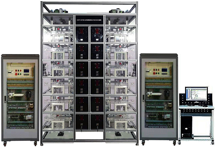 電梯控制技術(shù)綜合實訓(xùn)裝置是專門為職業(yè)院校開設(shè)的電氣自動化、機(jī)電一體化、機(jī)械制造與自動化等相關(guān)專業(yè)而研制的,裝置根據(jù)智能建筑中升降電梯的機(jī)構(gòu)按照一定的比例縮小設(shè)計,所用設(shè)備、器件與實際電梯基本一致,采用槽鋼方管框架結(jié)構(gòu)整體設(shè)計,正面使用透明有機(jī)玻璃面板,融低壓電氣、PLC、變頻調(diào)速、智能人機(jī)、傳感檢測、視頻監(jiān)控、智能考核系統(tǒng)等于一體,實現(xiàn)智能電梯復(fù)雜的開關(guān)量控制、時序邏輯控制。通過該裝置的操作訓(xùn)練可考核學(xué)生掌握智能電梯的裝調(diào)與維護(hù)綜合能力,如電梯呼梯盒的安裝、井道信息系統(tǒng)的安裝、平層開關(guān)檢測位置調(diào)整、門機(jī)機(jī)構(gòu)調(diào)整、電氣控制柜的器件安裝、接線、變頻器參數(shù)設(shè)置、PLC編程與調(diào)試、電梯群控功能調(diào)試、電梯故障排除、運(yùn)行維護(hù)等,除了滿足專業(yè)實訓(xùn)教學(xué),還能開展技能考核以及職業(yè)技能競賽。