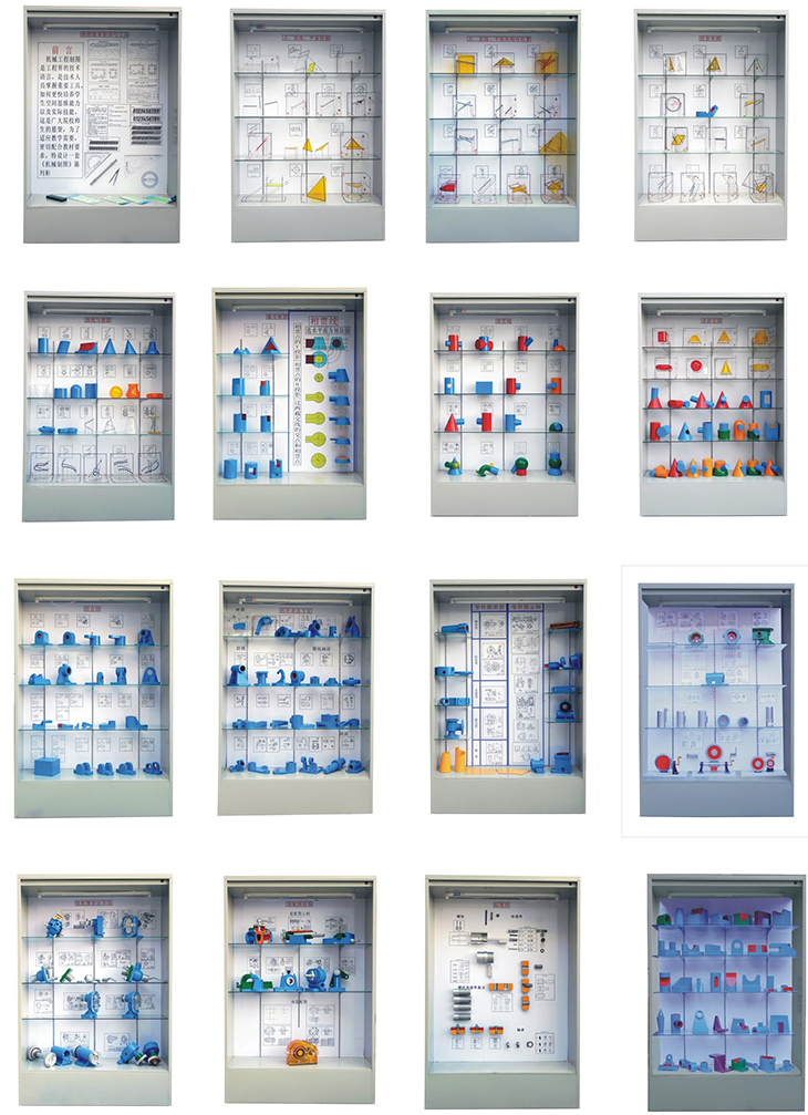 《機械制圖》示教陳列柜是適用于全日制普通中專、職工中學、電視中專、職業(yè)高中機械類專業(yè)的制圖教學,亦可供其它相近專業(yè)使用或參考。為突出培養(yǎng)學生畫圖能力和看圖能力這條主線,對機械專業(yè)學生理論學習,使用范圍增強認識,加深理解,本陳列柜是一套提高教學質量的理想設備。