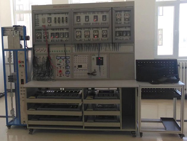 1、模型電梯設(shè)4層4站,由模擬井道架、轎廂、對重、曳引機、電梯門、門電機、各層站外呼盒及主要安全裝置組成,固定設(shè)置在實驗臺側(cè)面。模擬井道架內(nèi)需配置用于檢測轎廂位置的樓層感應(yīng)器、平層感應(yīng)器(與實際電梯相似)等,其接線端子引至模擬井道架的插接孔上。井道架采用金屬材料為主體支架,有機玻璃封閉!镌O(shè)備必須采用臺式結(jié)構(gòu),設(shè)置活動式抽屜電氣板,每層抽屜板均設(shè)置有公共接線板(總線型接線方式,總線連接點數(shù)必須達(dá)到120點以上),抽屜電氣板之間采用工業(yè)坦克鏈連接,公共抽屜板連線采用真實電梯多芯隨行電纜。
