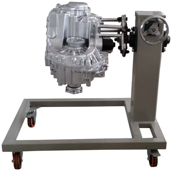 采用減速翻轉(zhuǎn)機(jī)構(gòu),可使變速器旋轉(zhuǎn)任意角度,并能任意位置鎖止,便于學(xué)生從不同的角度進(jìn)行拆卸和裝配。