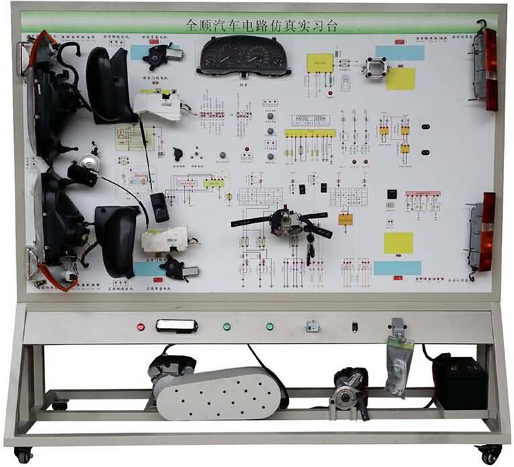 2.設(shè)備面板采用耐創(chuàng)擊、耐污染、防火、防潮的高級(jí)鋁塑板,表面經(jīng)特殊工藝噴涂底漆處理;面板打印有永不褪色的彩色電路圖;學(xué)員可直觀對(duì)照電路圖和實(shí)物,認(rèn)識(shí)和分析汽車整車電器各系統(tǒng)的工作原理。